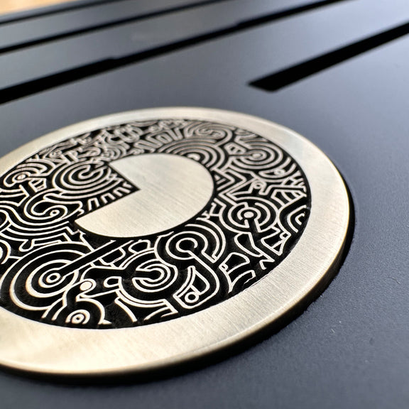 A recessed pocket is included in this version, supplied with a solid brass marker. This marker functions as a maker’s mark rather than a feature piece, keeping the focus on the display system itself.